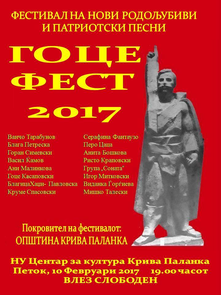 Во петок на 10 февруари 2017 година во НУ Центарот за култура во Крива Паланка со почеток во 19 часот ќе се одржи фестивалот ГОЦЕ ФЕСТ. Фестивалот ќе биде посветен на нови родољубиви и патриотски песни со фолклорна мелоритмика и богато историско минато на македонскиот народ. Учество на фестивалот ќе имаат врвни македонски музички имиња од фолк сцената.