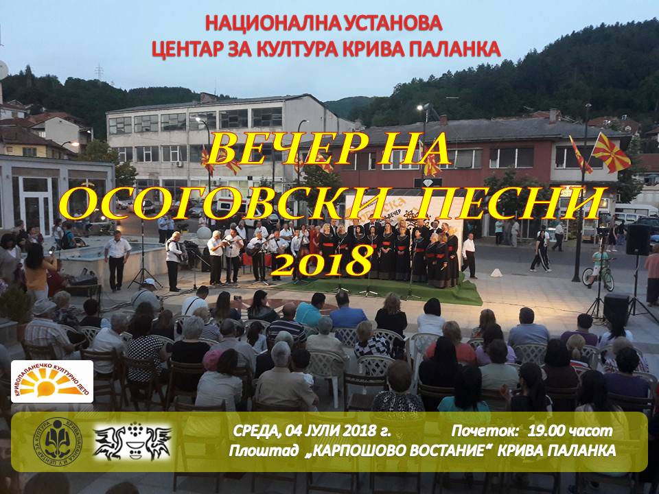 НУ Центар за култура Крива Паланка организира „Вечер на осоговски песни 2018“. Настанот кој е дел од програмата на Кривопаланечко културно лето ќе се одржи на 04.07.2018 (среда) на плоштадот „Карпошово востание“ со почеток во 19 часот.