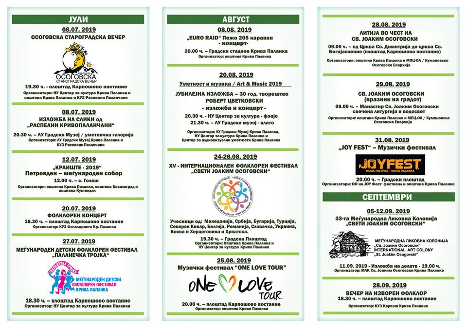 Манифестацијата „Кривопаланечко културно лето 2019″ ја организираат Општина Крива Паланка, ЛУ Градски музеј и НУ Центар за култура, во соработка со повеќе локални здруженија од областа на културата и уметноста, а е финансирана од Министерство за култура на Република Северна Македонија, како и останати поддржувачи, како рудници „Булмак- Минстрој”.