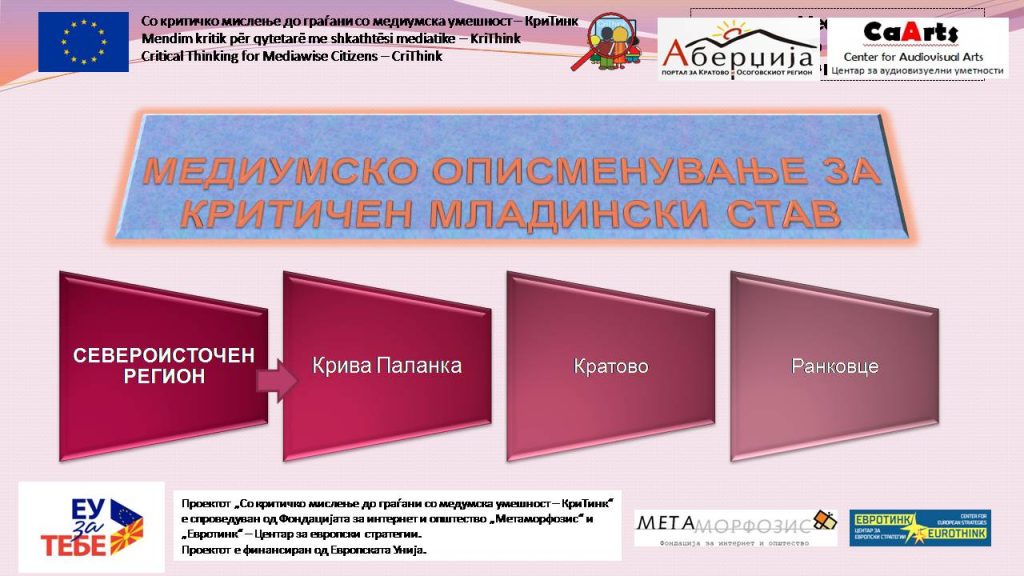 Во проектот беа опфатени 80 ученици од 9-то одделение од општинските основни училишта „Јоаким Крчовски“ и „Илинден“ од Крива Паланка, „Х.Т.Карпош“ од Ранковце и „Кочо Рацин“ од Кратово. Беа спроведени повеќе проектни активности за формирање на критичко мислење кај младите, препознавање на лажни вести, заштита од интернет злоупотреби и креирање на медиумски пораки.