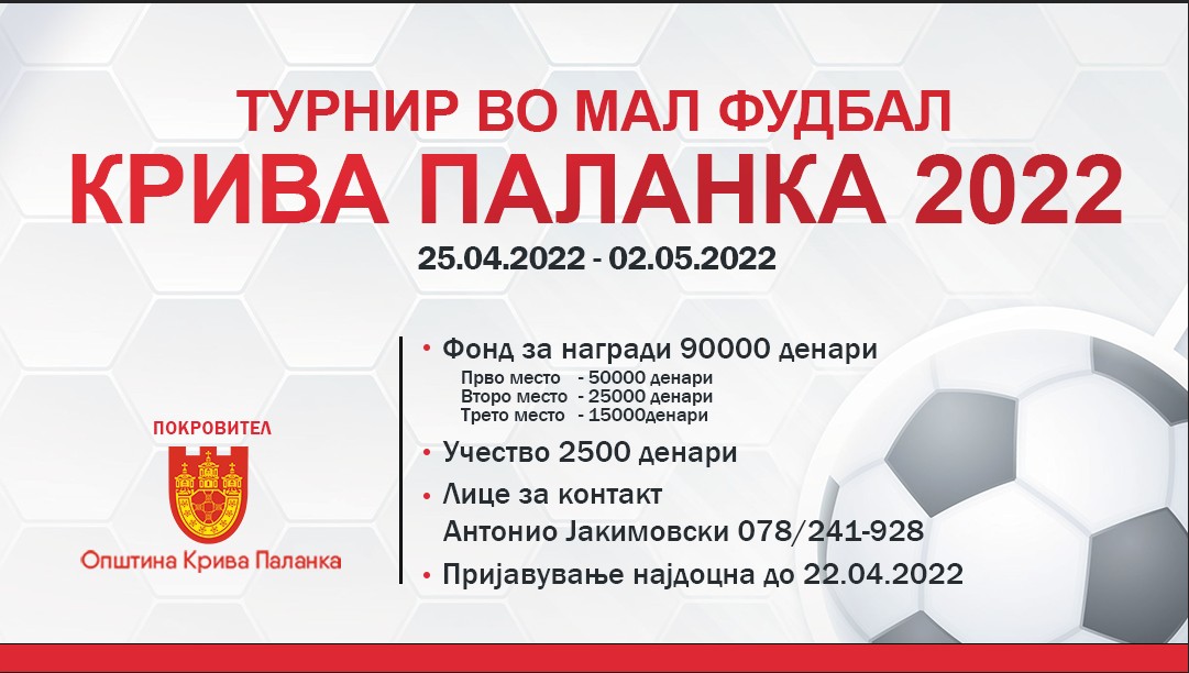 По повод празникот 1-Мај, Општина Крива Паланка организира турнир во мал фудбал во периодот од 25.04.2022 до 02.05.2022 година.