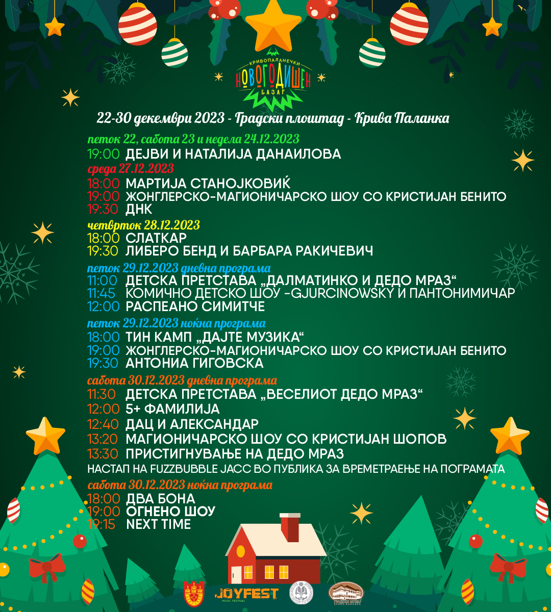 Програмата ќе понуди бројни настапи на наши, македонски, изведувачи и бендови, а најмладите и тинејџерите ќе уживаат во креираната за нив забавна шема: детски претстави, концерти, жонглери, комични настапи и секогаш спектакуларното пристигнување на Дедо мраз  на 30.12.2023, сабота.