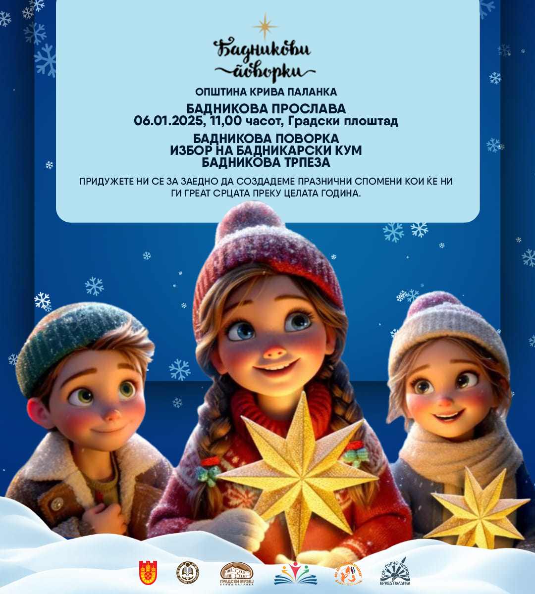 Oпштина  Крива Паланка и годинава организира  традиционалната Бадникова прослава, која ќе се одржи на 06.01.2025 година, понеделник, со почеток во 11,00 часот, на Градскиот плоштад, по повод големиот верски празник кој го најавува Христовото раѓање.