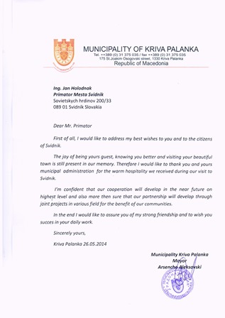 Писмо од градоначалникот Алексовски до неговиот словачки колега Јан Холодњак