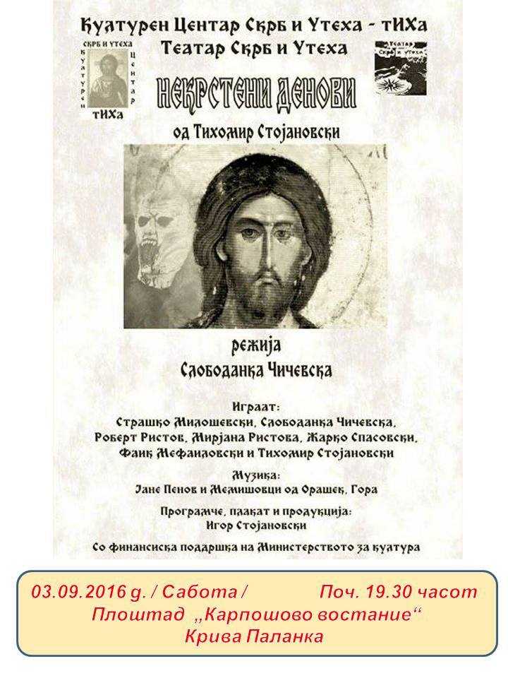 Во сабота на 03.09.2016 на плоштадот „Карпошово востание“ ќе биде изведена театарската претстава „Некрстени денови“ од Тихомир Стојановски. Претставата е со почеток во 19.30 часот, а во изведба на театарот „Скрб и утеха“.