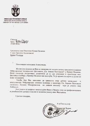 Амбасадорот на Р.Србија во Р.Македонија, Н.Е. Томислав Ѓурин упати писмо до Градоначалникот Арсенчо Алексовски во знак на благодарност за топлиот прием при отварањето на Меѓународниот театарски фестивал „Свети Јоаким Осоговски“ во Крива Паланка.