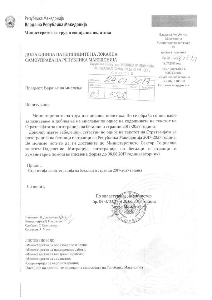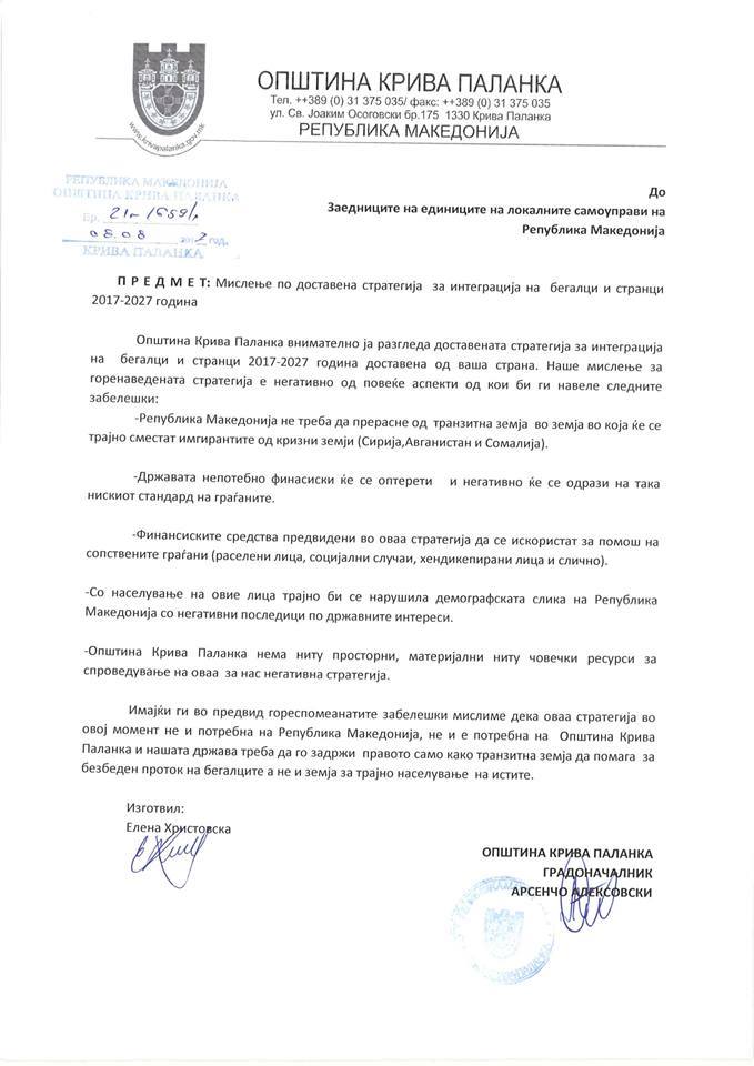На барање на Владата на Република Македонија – Министерството за труд и социјална политика за давање на мислење по однос на Стратегија за интеграција на бегалци и странци 2017-2027 година, Општина Крива Паланка врз основа на детална и длабинска анализа на стратегијата даде негативно мислење поради повеќе аспекти :