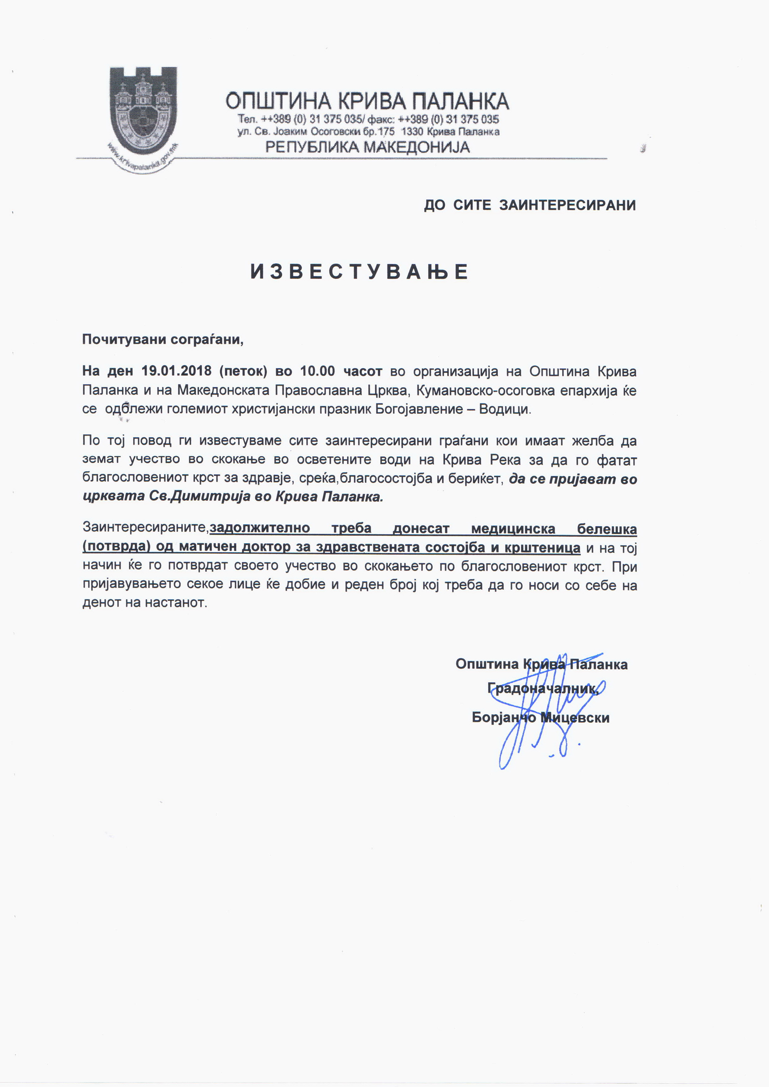 На ден 19.01.2018 (петок) од 10.00 часот во организација на Општина Крива Паланка и на Македонската Православна Црква, Кумановско-осоговска епархија ќе се одбeлежи големиот христијански празник Богојавление – Водици.