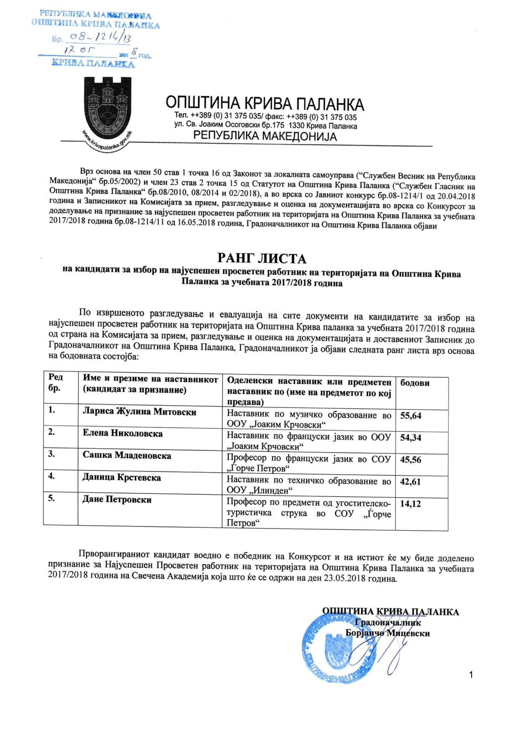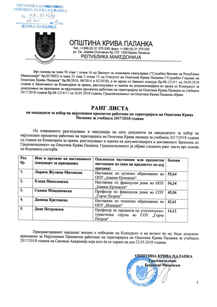 Конечни резултати од Конкурс за доделување на признание за најуспешен просветен работник на територијата на општина Крива Паланка за учебната 2017/2018 година.