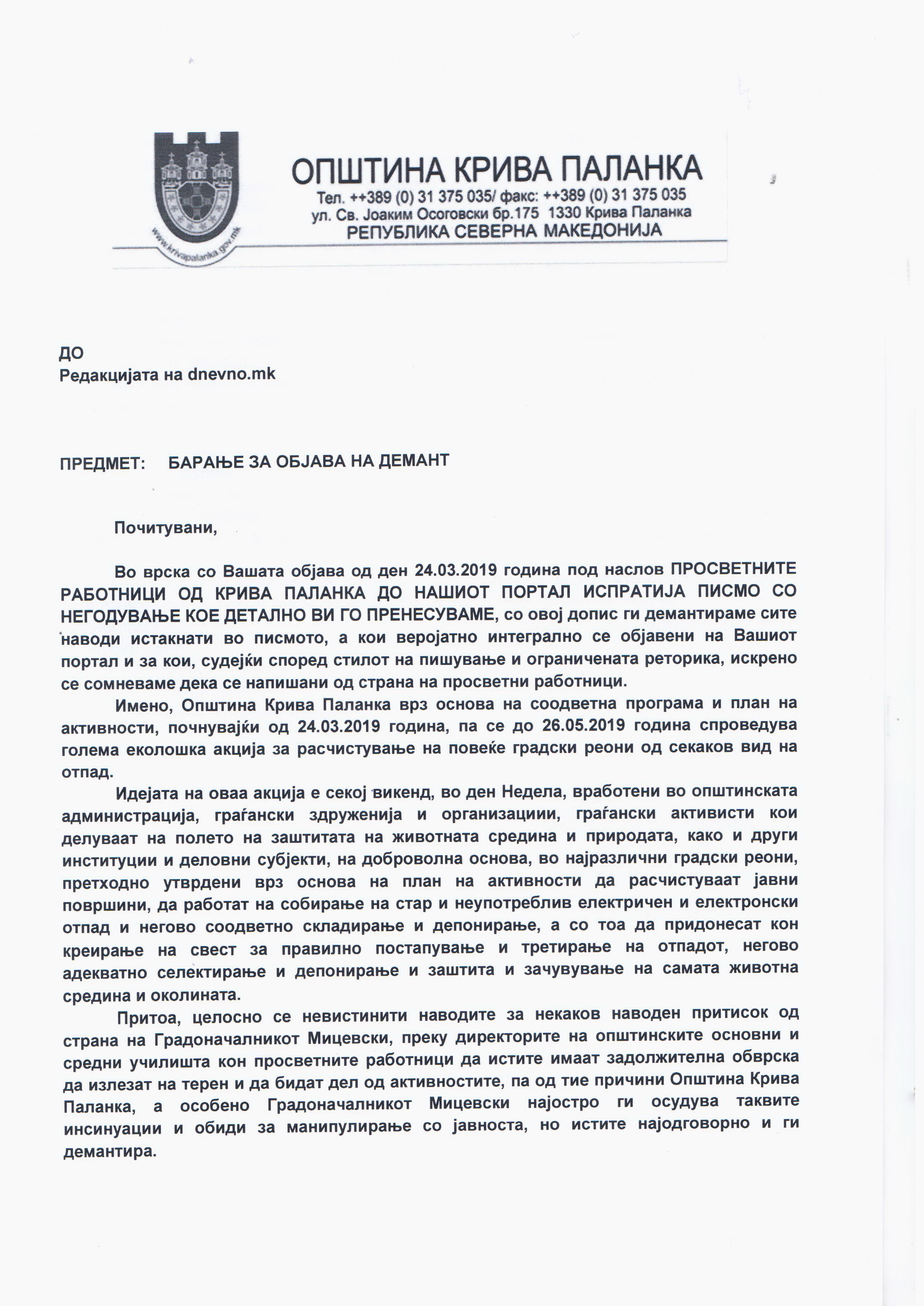 Во врска со објавата на порталот ДНЕВНО.МК од ден 24.03.2019 година, насловена како ПРОСВЕТНИТЕ РАБОТНИЦИ ОД КРИВА ПАЛАНКА ДО НАШИОТ ПОРТАЛ ИСПРАТИЈА ПИСМО СО НЕГОДУВАЊЕ КОЕ ДЕТАЛНО ВИ ГО ПРЕНЕСУВАМЕ, Општина Крива Паланка до порталот ДНЕВНО.МК испрати Барање за објава на демант, преку кој остро ги осудува и демантира наводите кои претставуваат обични инсинуации и обиди за манипулирање со јавноста, а содржината на барањето и демантот на објавата, заради соодветно и навремено информирање на јавноста, интегрално Ви го пренесуваме.