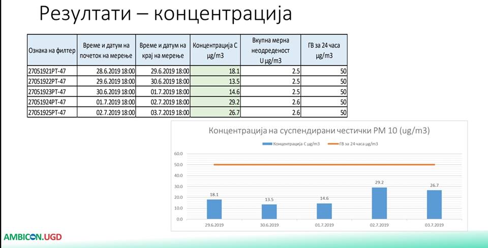 Измерените концентрации на суспендирани цврсти честички ниту еднаш во текот на мерењата не ги надминаа просечните 24 часовни вредности пропишани со заштита на човековото здравје, а со оглед на сушниот временски период можат да се оценат како релативно ниски. Во хемискиот состав на суспендираните честички доминираат литогени елементи и во основа го одразуваат геолошкиот состав на подрачјето на генерирање. Содржината на тешки метали е минимална и под препорачаните гранични вредности (за металите за кои има препораки).