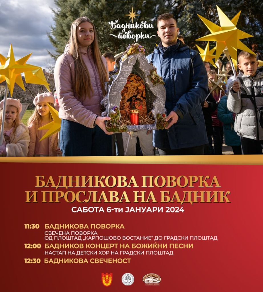 Манифестацијата за прослава на Бадник започнува со свечена бадникова поворка од плоштадот “Карпошово востание” во 11.30 часот и ќе движи низ главната улица до Градскиот Плоштад.