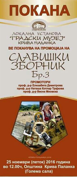 Ве известуваме дека промоцијата на третото издание на Славишки зборник ќе се одржи на 25 ноември (петок) во просториите на Општина Крива Паланка (голема сала), во 12:00 часот. Ќе ни биде особена чест ако со Вашето присуство не удостоите заедно да го промовираме новото издание на Славишки зборник, а со тоа и културното наследство на кривопаланечкиот крај.